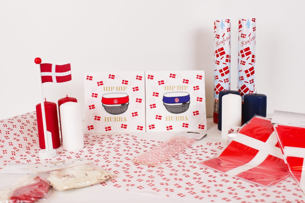 - Pynt op med flag og festlige servietter for at skabe den rette stemning, selv i skolens omgivelser. Små bordflag, servietter med studenterhuer og et par dekorative lys kan nemt transporteres og stilles frem.