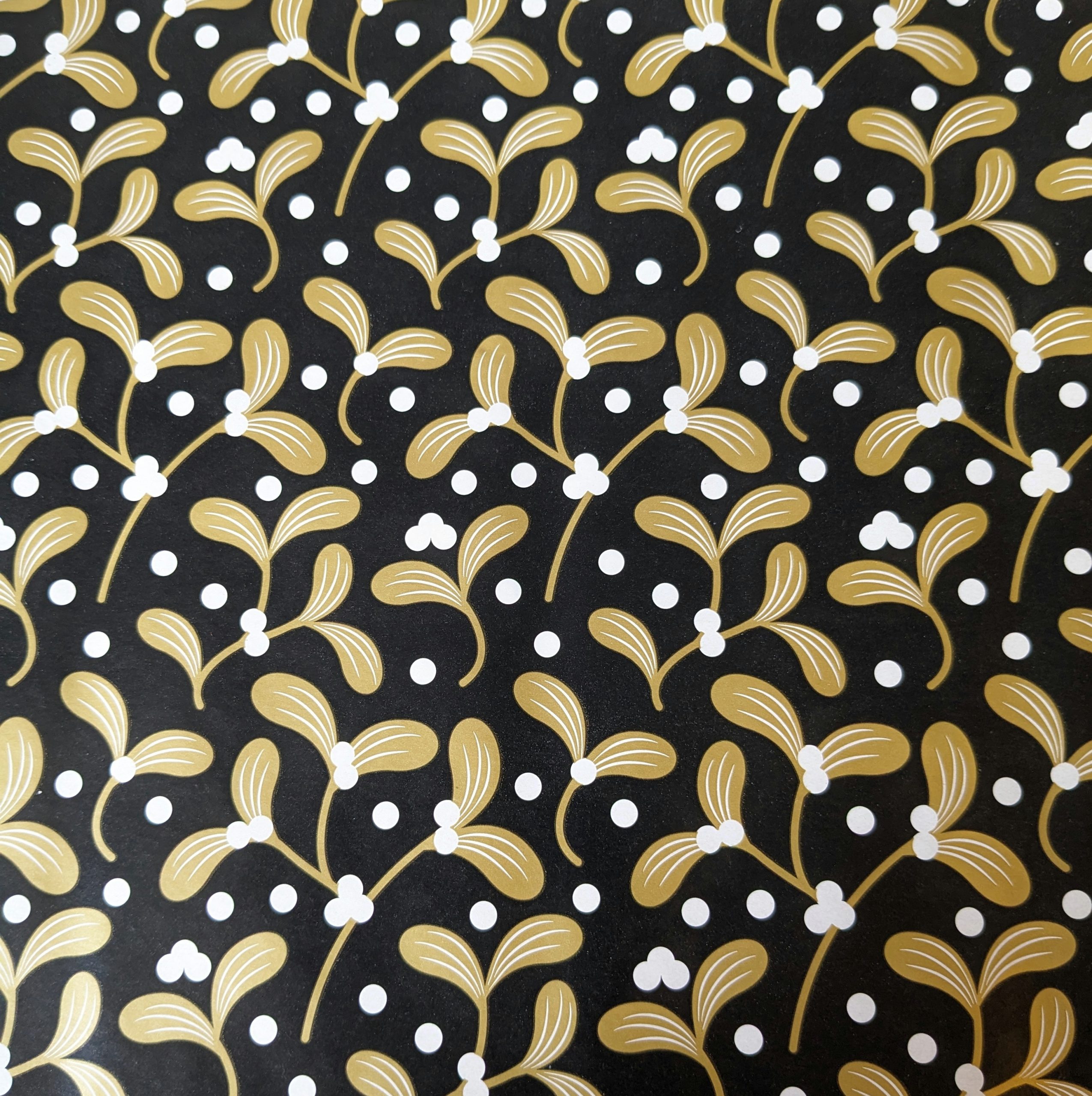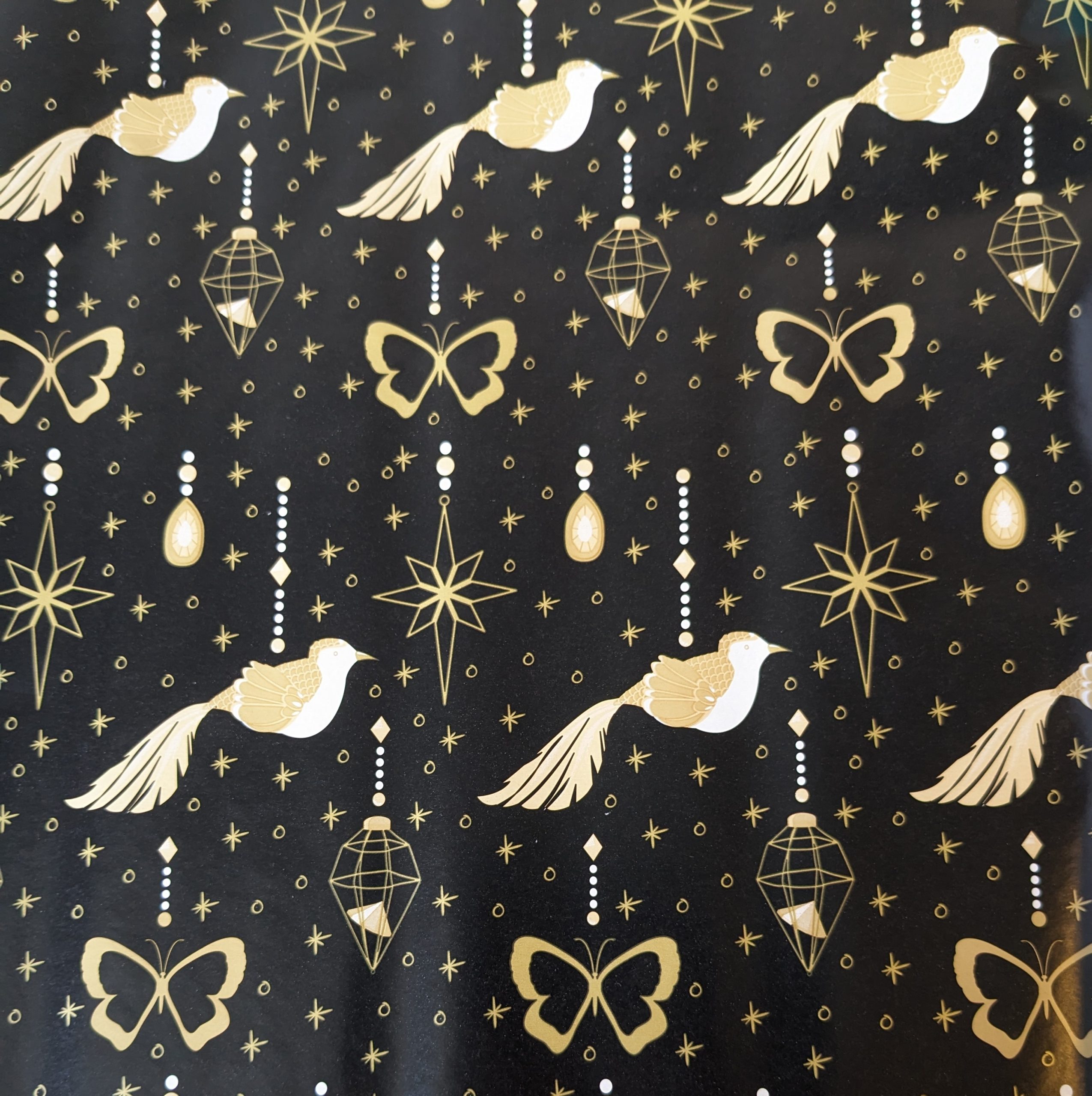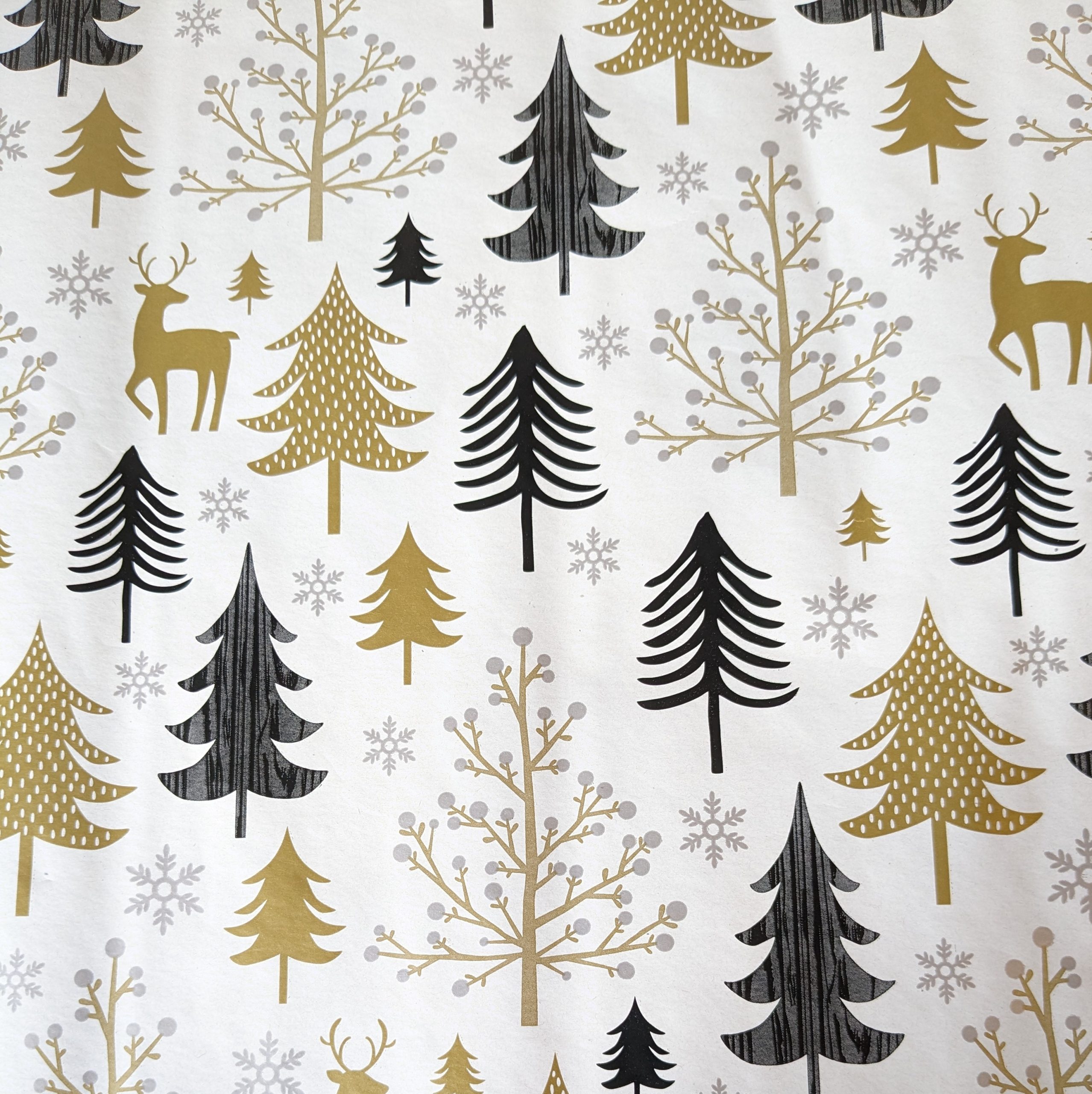 3 ruller julegavepapir i guld/sorte/hvide/blå designs.