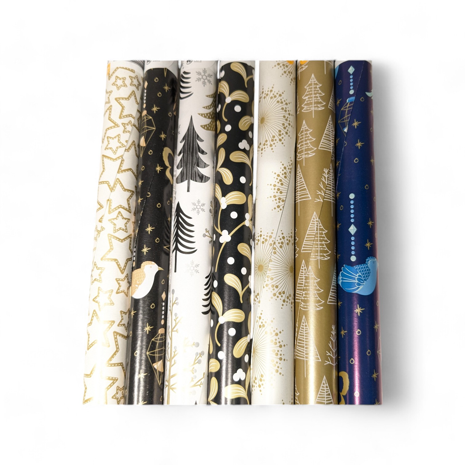 seks ruller julegavepapir i guld sort, blå og hvid