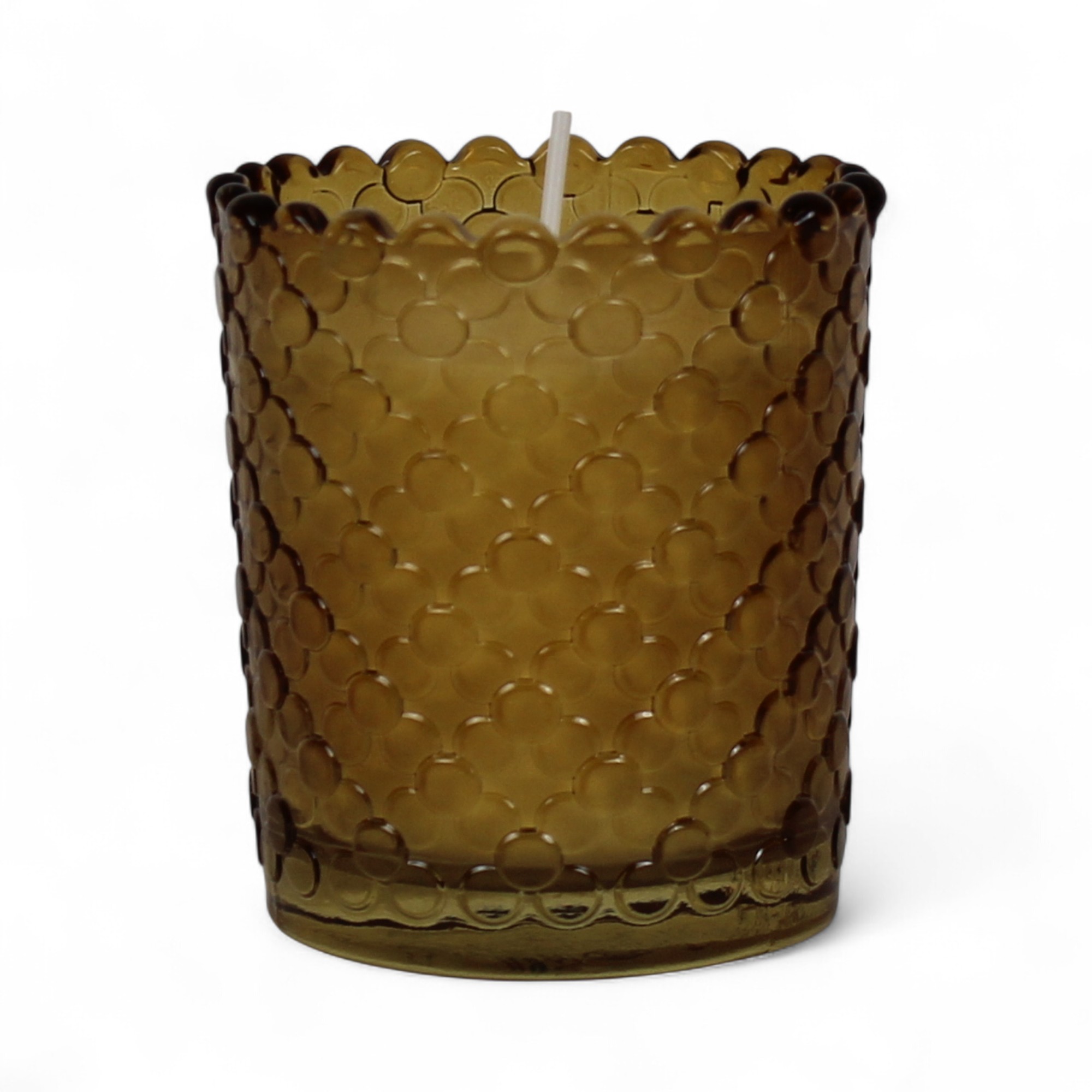 Glas med duftelys med hvid stearin og mild duft.