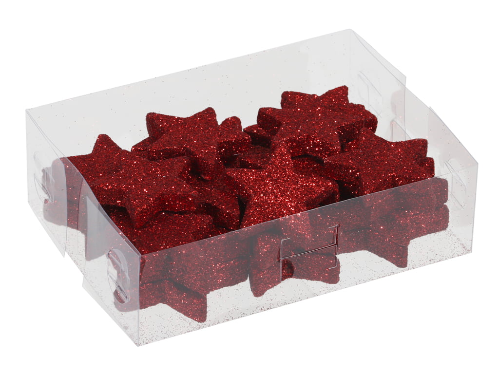 Glitterstjernerne i farven rød måler: 4 x 5 cm.