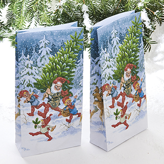 Posen er lavet af papir med Vilhelm Hansens motiv af nissen der fælder årets juletræ.
