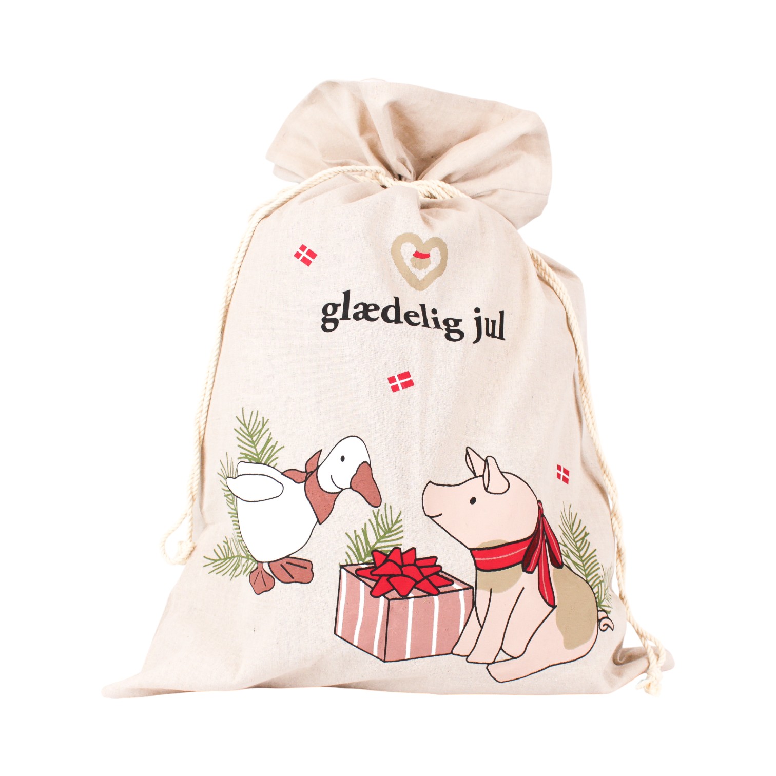 stor beigefarvet gavesæk til julemanden med snørelukning i løbegang med pynt af gris og gås