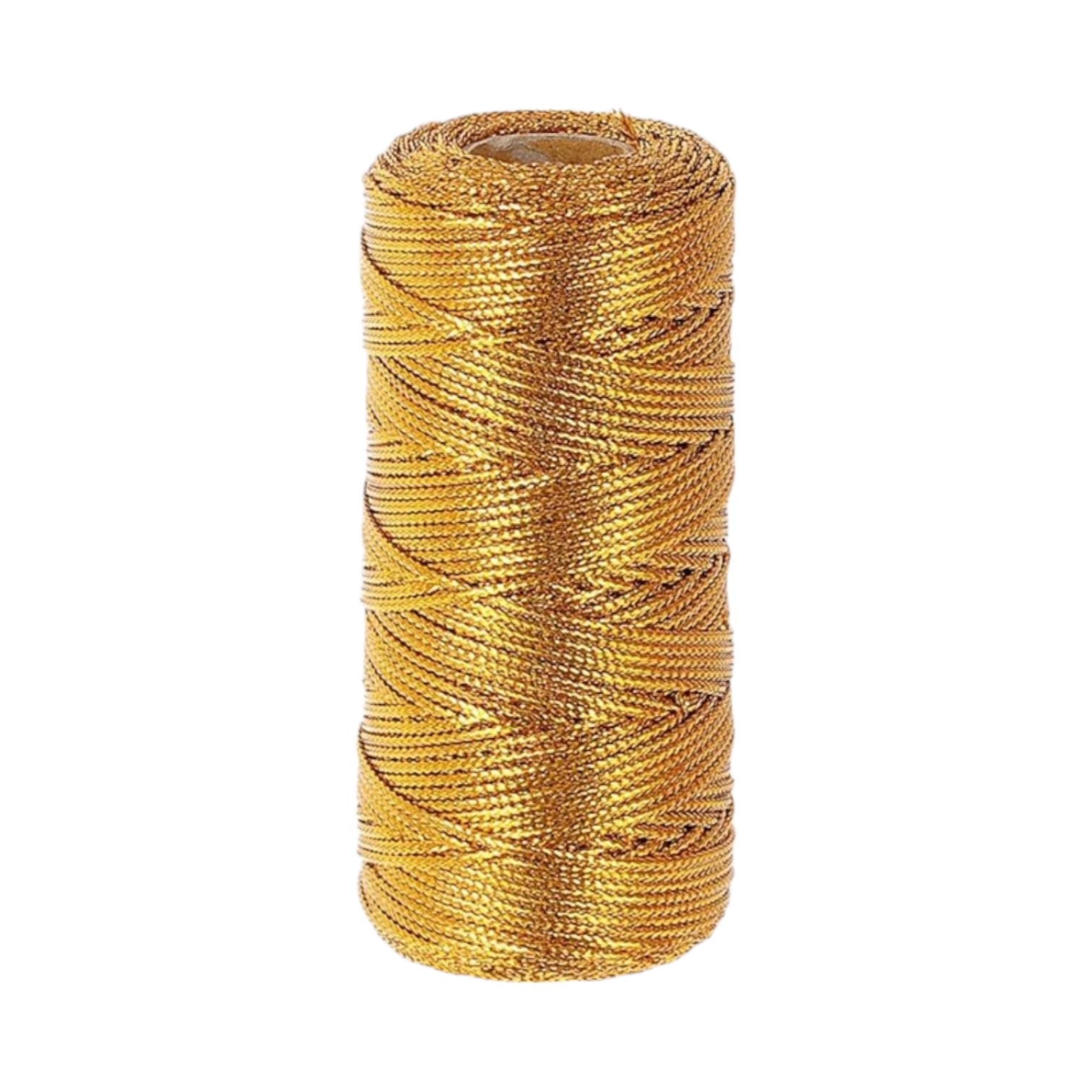 Blank guld snor på rulle med 100 meter. Guldsnoren er ca. 1 mm. tyk. og er sammenflettet af flere tynde guldtråde. Særdeles stærk og velegnet til ophæng af alt slags pynt samt til gaveindpakning.
