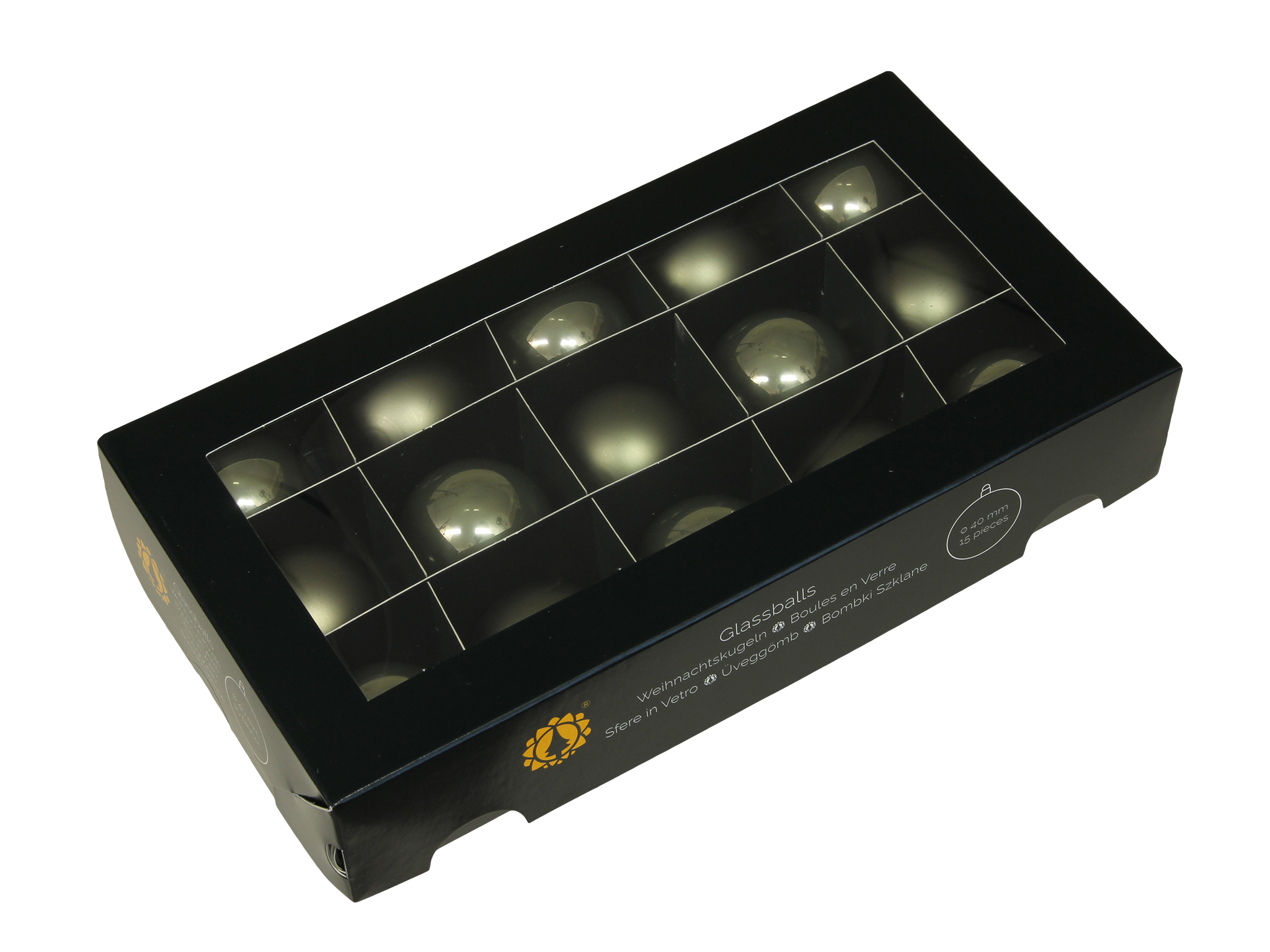 Boxen indeholder julekugler i glas til f.eks. dit juletræ.
