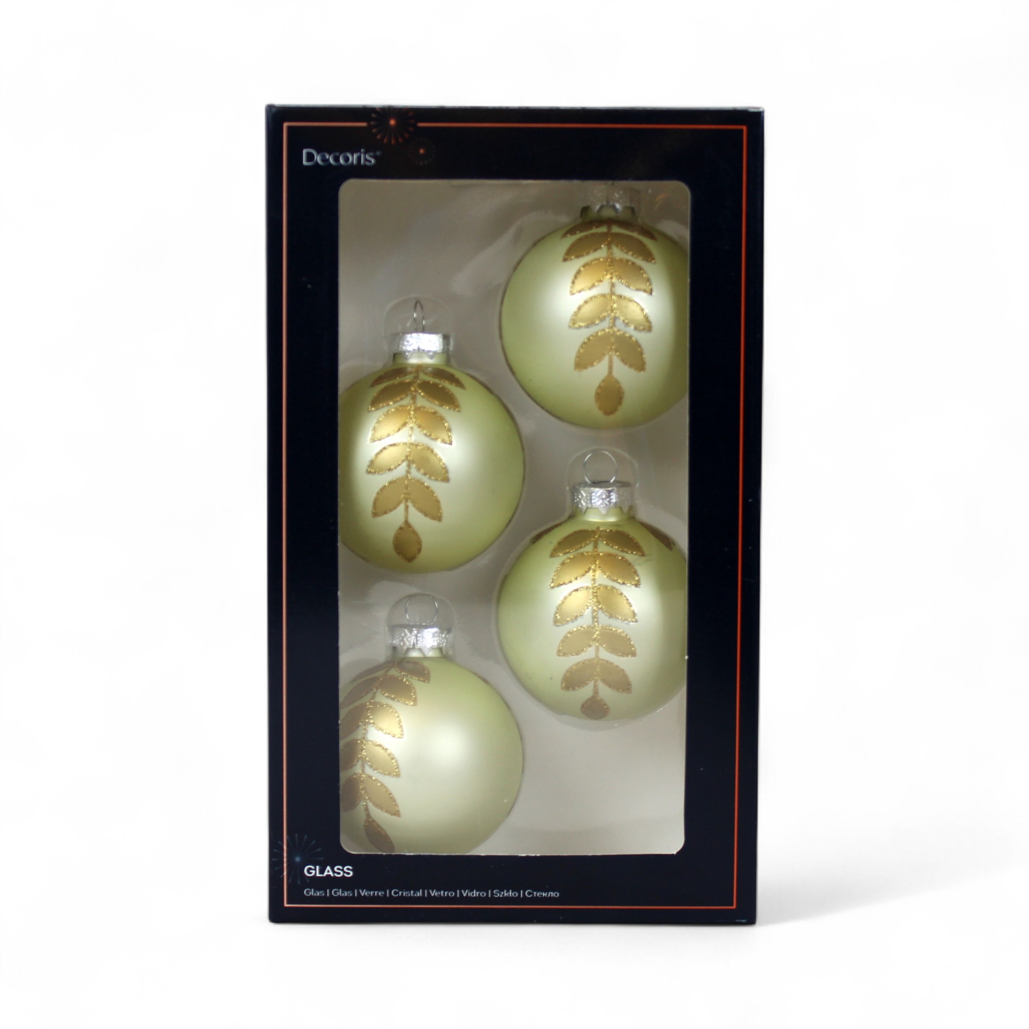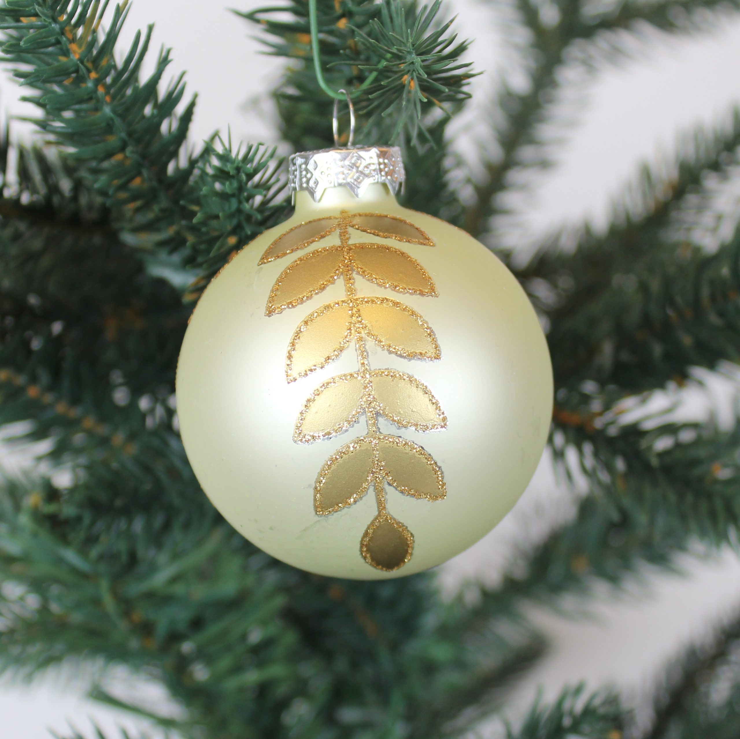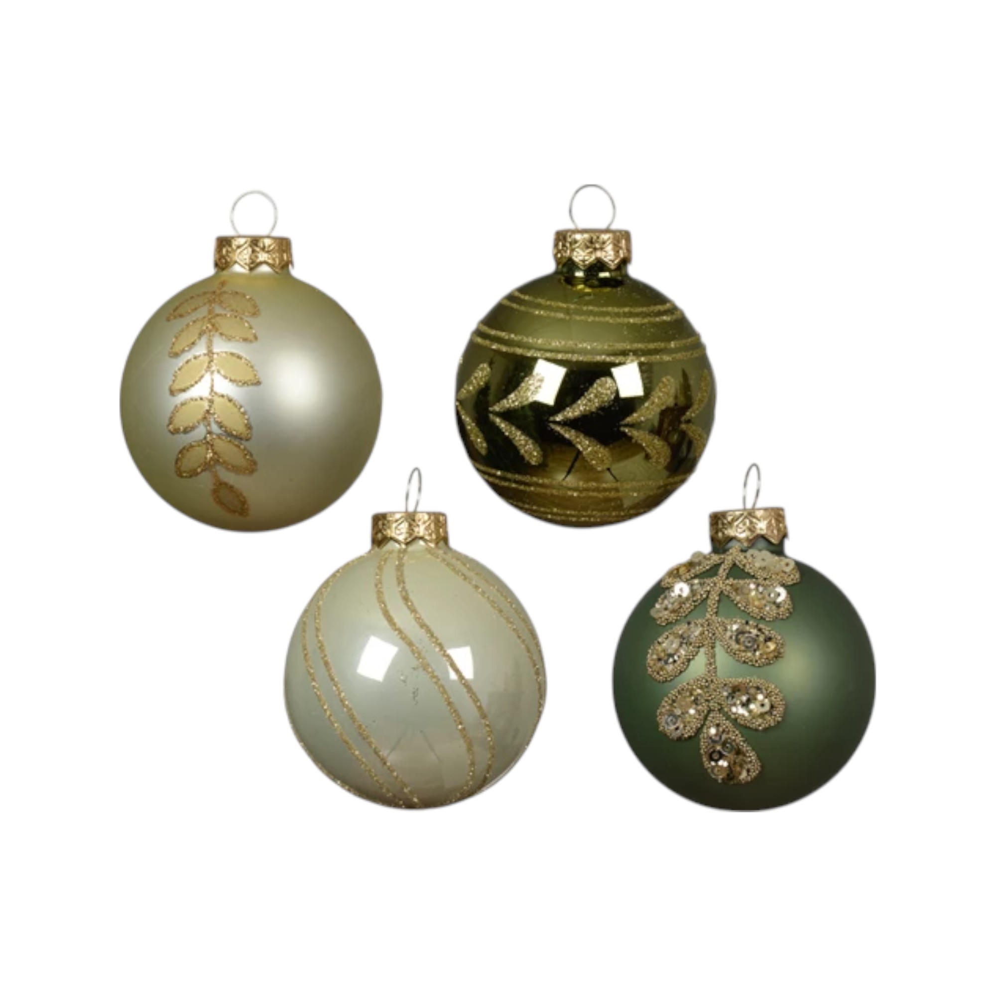 Dekorerede glas julekugler. LYSEGRØN matte med guld glitter blad ranke som dekoration på julekuglen. 4 stk. ens i pakken.