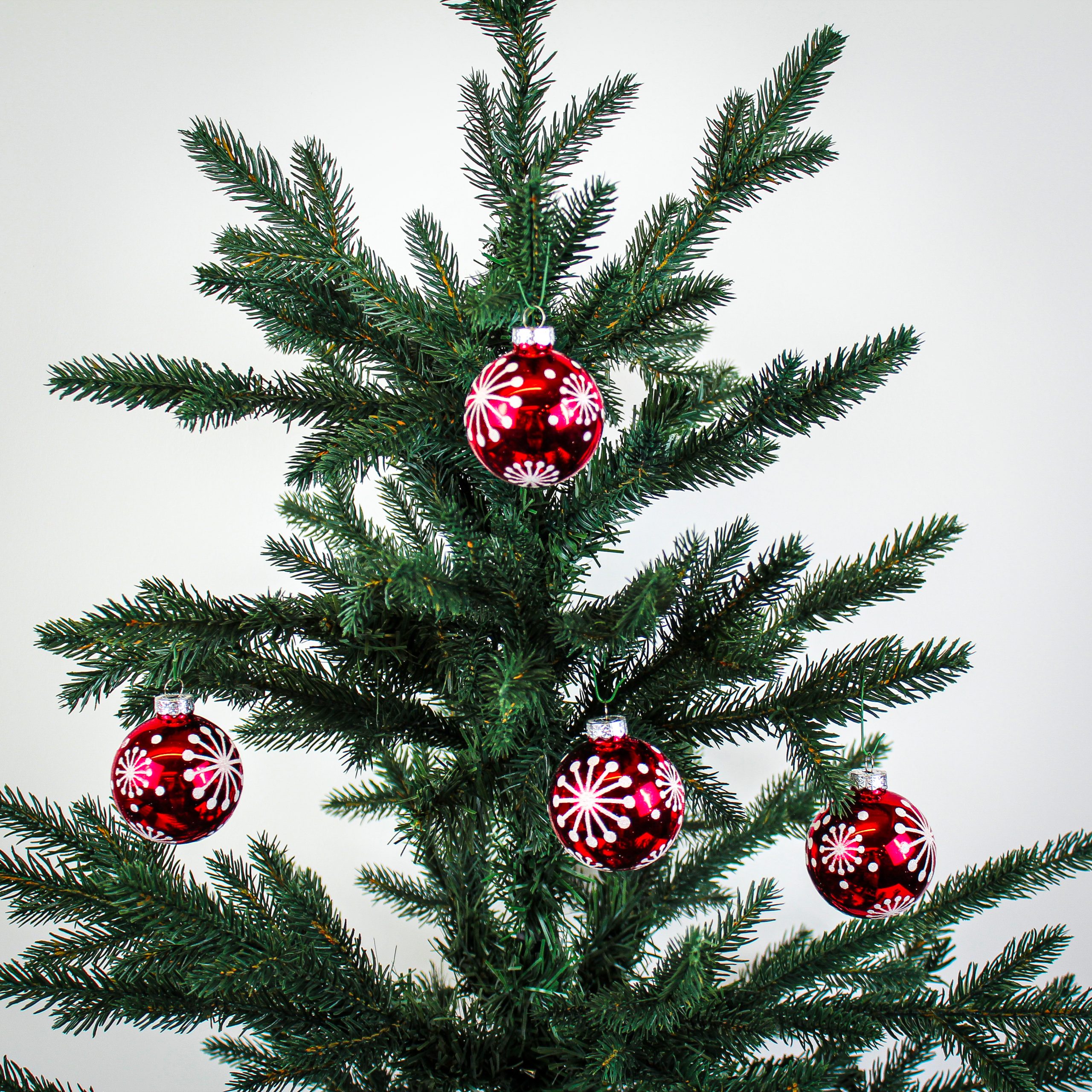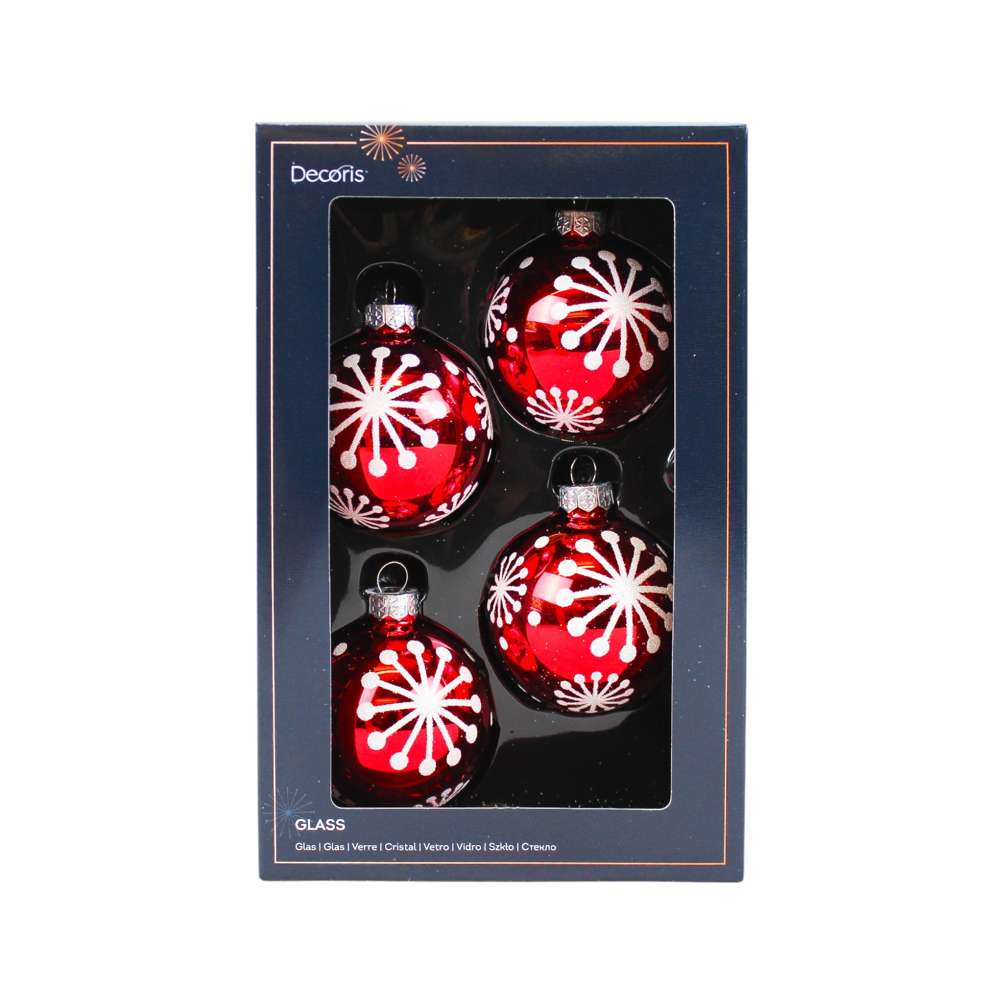 Dekorerede glas julekugler. RØDE blanke med flere hvide glitter is-krystaller rundt om på julekuglen. 4 stk. ens i pakken.