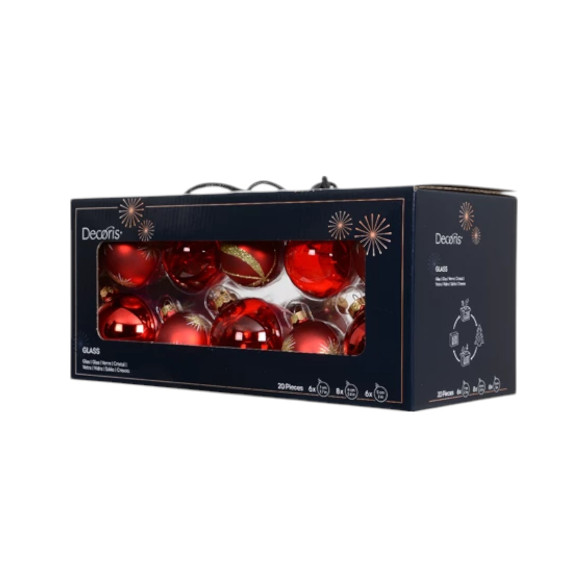 Julekuglerne leveres i en flot og praktisk karton æske med håndtag. Gem kassen til sikker opbevaring af dine glasjulekugler efter jul.