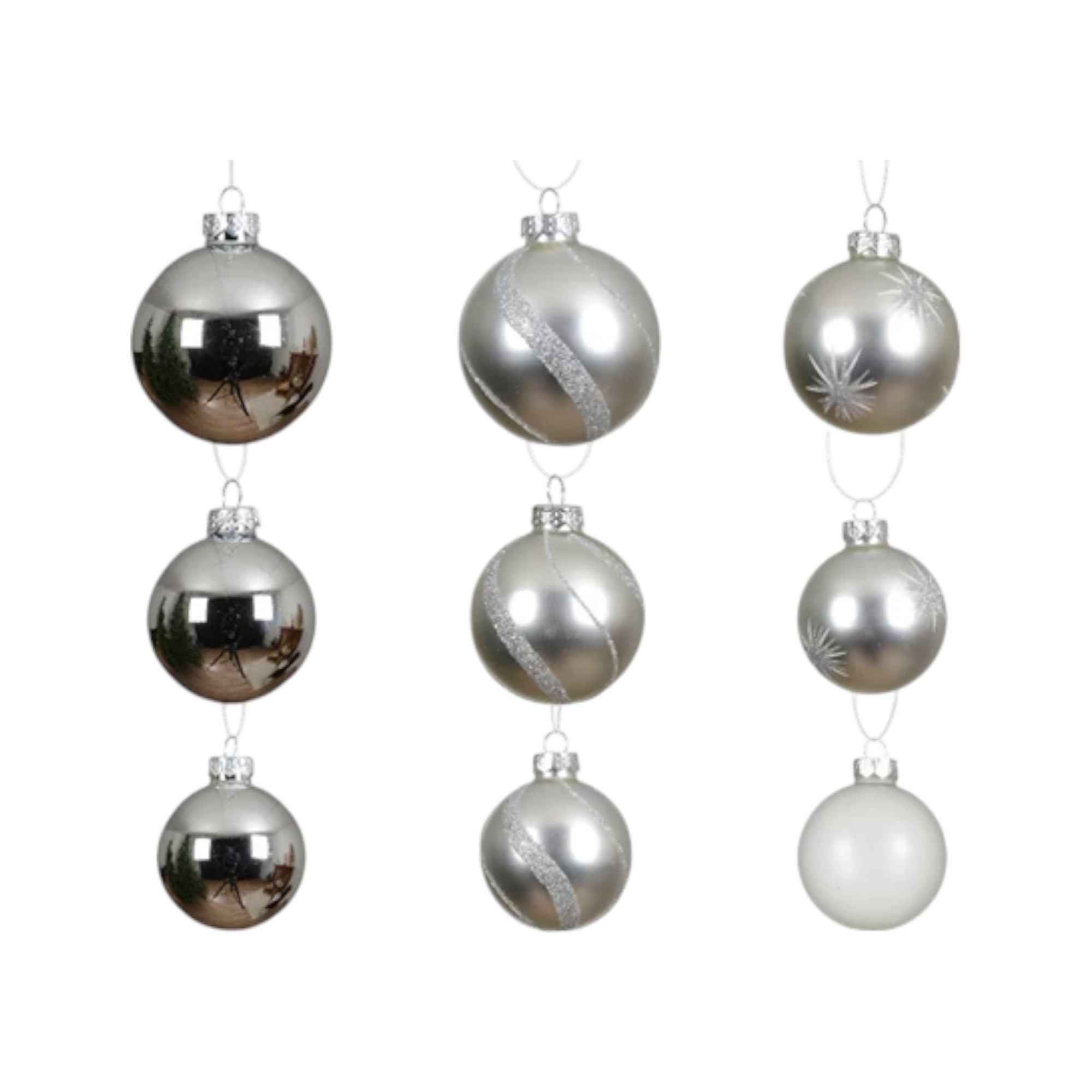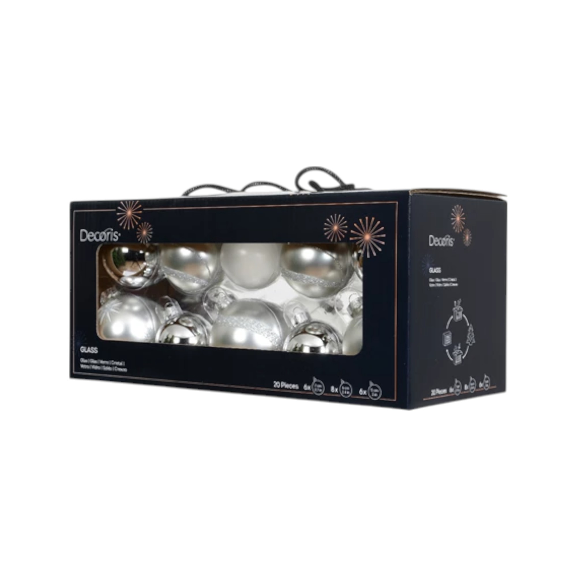 Glas julekugler i en blandet kasse med 20 stk. i sølv nuancer.