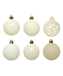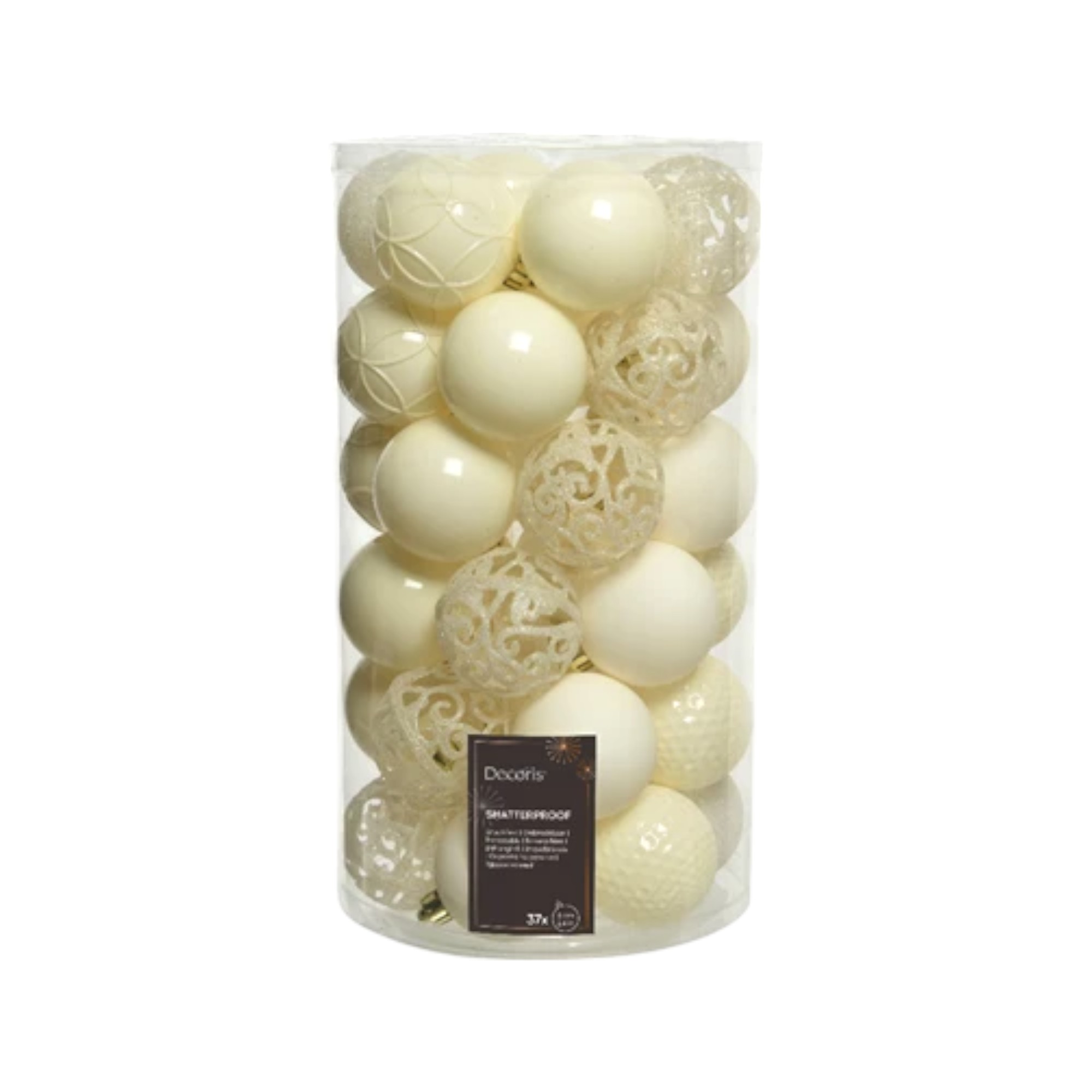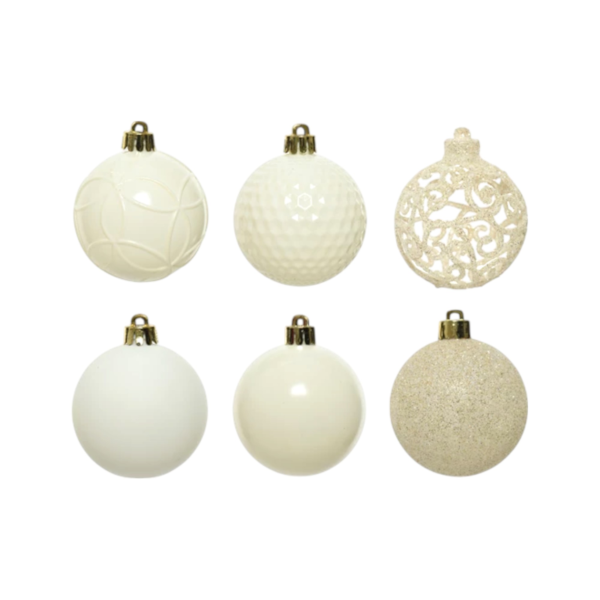 plastik julekugler med diameter seks centimeter i farven uldhvid og med flere forskellige overflader syvogtredive styk i pakken