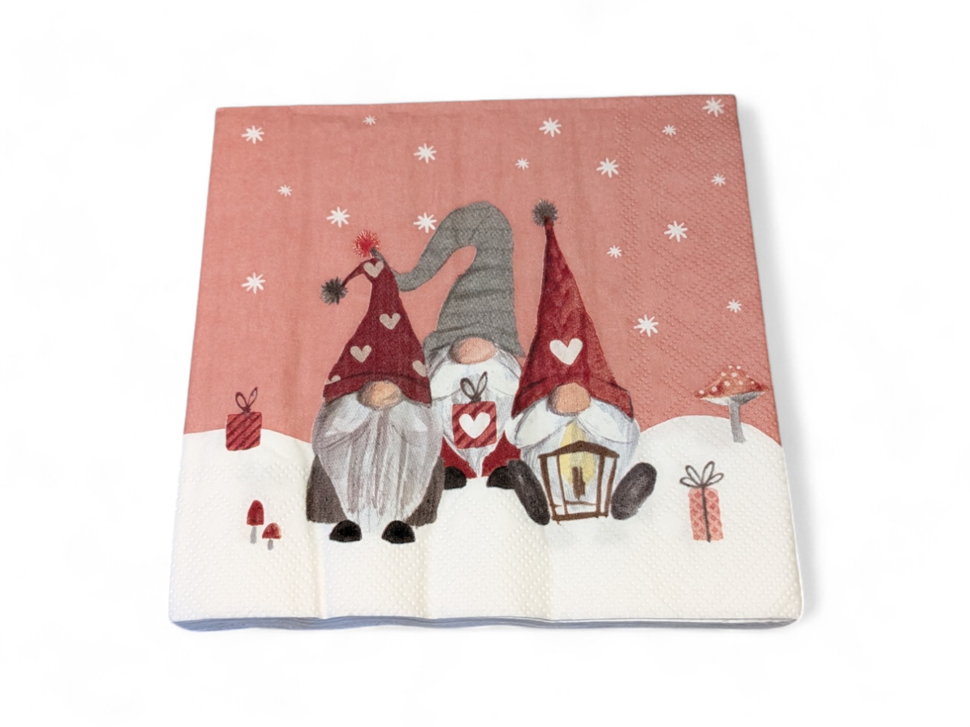 20 styk hvide og laksefarvede frokostservietter med tre julenisser med stort skæg