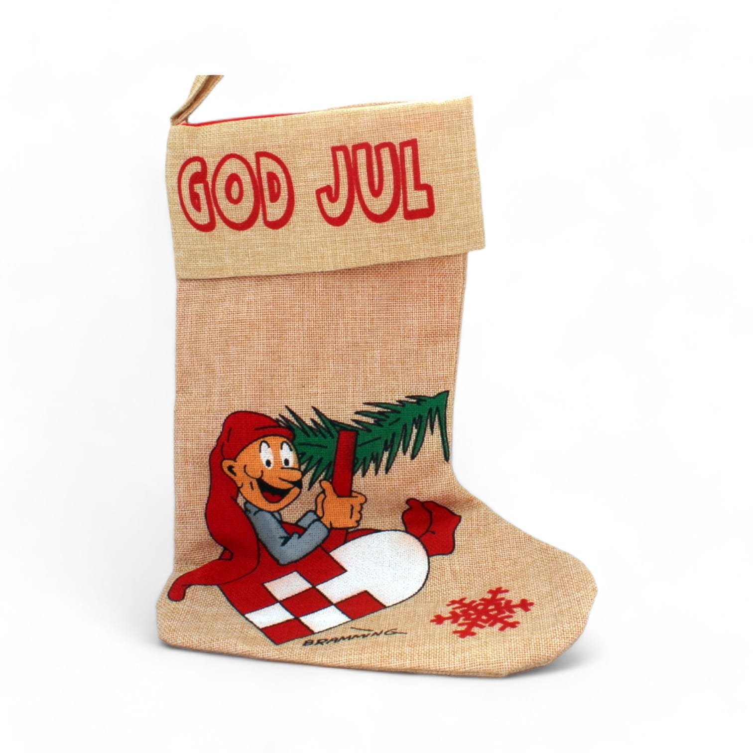 Bramming julesok til gaver. Julesok til gaver, kaldes også gavesok til små julegaver. Flot julestrømpe med den nostalgiske Bramming nisse. Er du den fantastiske og gavmilde mor, bedstemor, moster eller faster som laver mange pakkekalendere til børnene, så se denne nemme idé til hvad gaverne kan puttes i. Denne flotte julesok ligner julemanden. Julesok til gaver, kaldes også gavesok til julegaver. Det kan være små kalendergaver, som julemanden lægger i julesokken om natten. Det kan også være lidt større gaver fra julemanden, som lægges i børnenes gavesok som adventsgave de 4 adventssøndage op til juleaften. En flot julesok vil altid være et kæmpe hit hos børn og barnlige sjæle. Børnene vil elske at kigge efter gaver i deres sokken hver morgen i december måned, for at se om julemanden eller nissen har været med en gave til dem. Hæng børnenes julesok op i køkkenet eller i stuen, så du også kan glæde dig over børnenes begejstring, når de skal kigge i den og finde dagens kalendergave. Her på webshoppen alttiljul.dk har vi altid mange forskellige gavesokker til jul at vælge imellem og i mange prisklasser. Hos os kan du finde julesokker til billig pris. Du kan også finde forskellige varer som er perfekte som kalendergaver til pakkekalender og adventsgaver til børn og voksne. Du kan gøre det i god tid inden jul, så du undgår stress og jag, for at få alle de små pakker bragt i orden. Og det er nemt at bestille online og få varerne sendt enten til din hjemme adresse, din arbejdsplads eller til en af de mange GLS pakkeshops, som findes rundt om i landet. På den måde undgår du også, at dine børn ser hvad du køber. Du kan i al hemmelighed gøre dine indkøb og få dem tilsendt og gemt af vejen, så dine børn ikke opdager, hvad du har købt til dem. Hobbyartikler er også altid et hit som kalendergave til børnene. Vi har mange forskellige hobbyposer, stjernestrimler, klippeark med kravlenisser og kræmmerhuse og meget, meget mere.