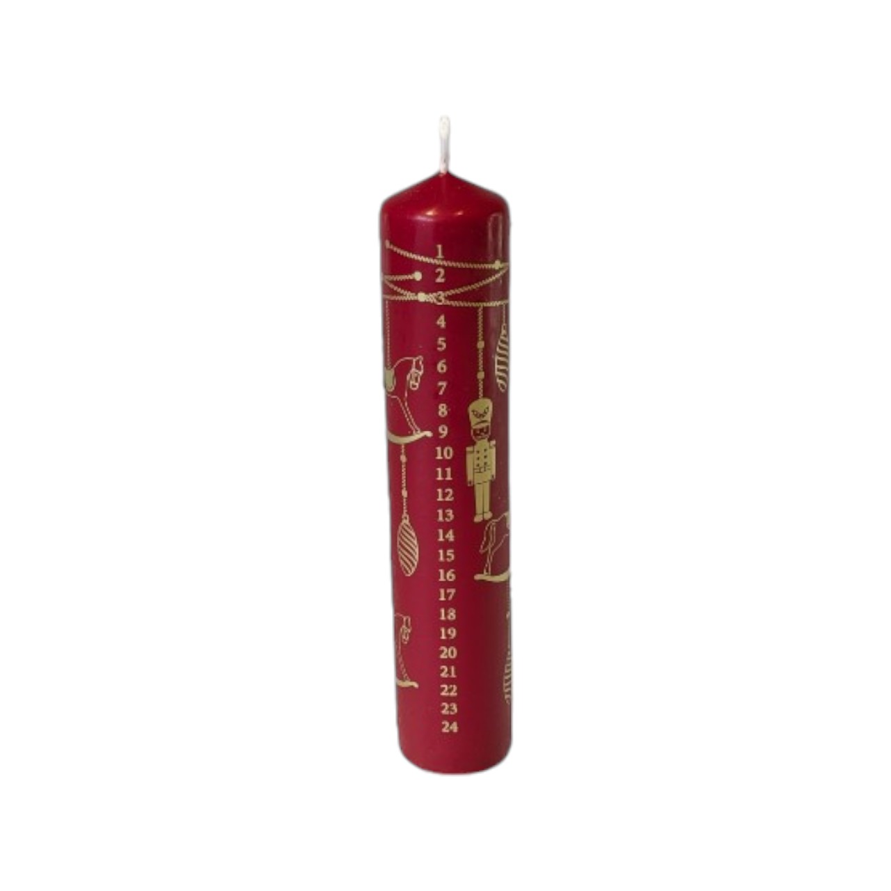 rødt kalenderlys på 5 x 23 centimeter med mønster i guld med nøddeknækker og julepynt