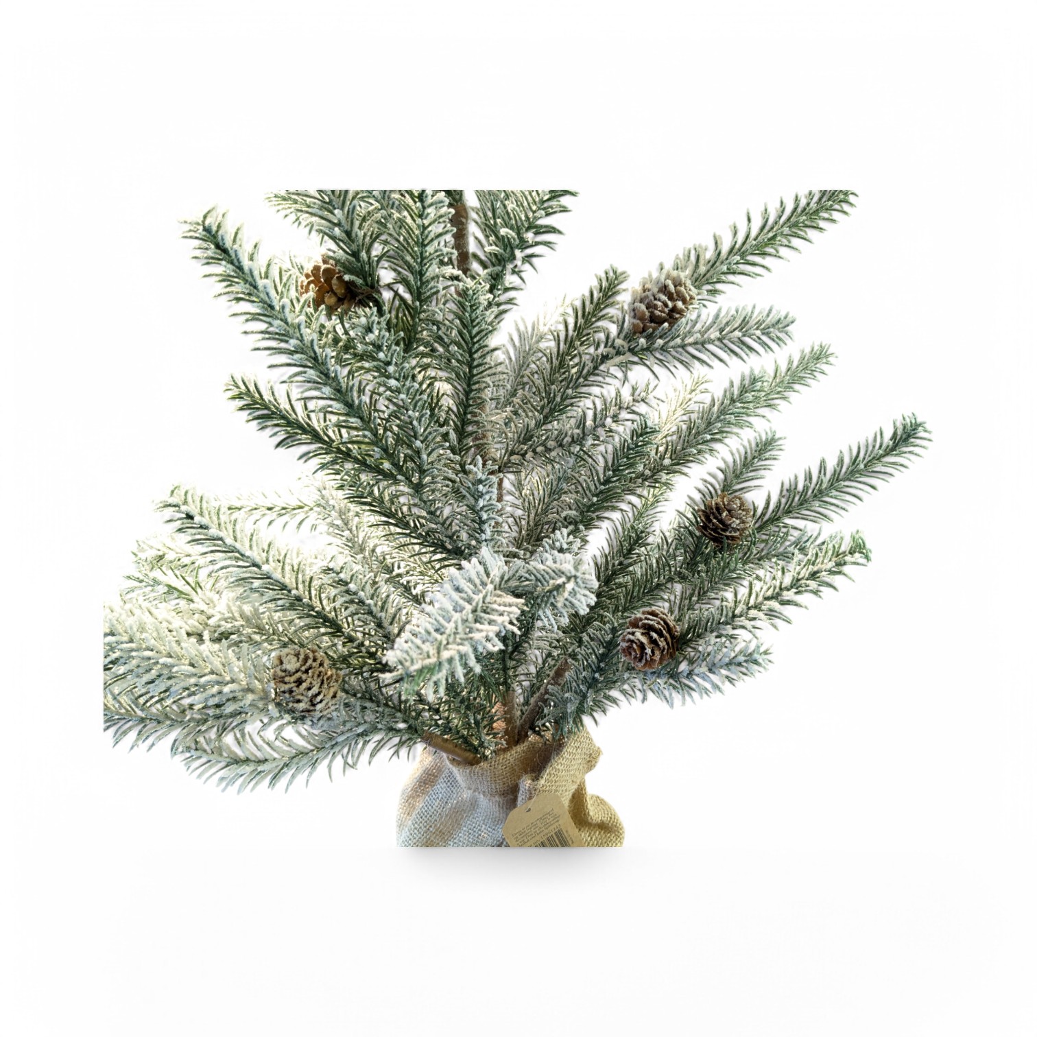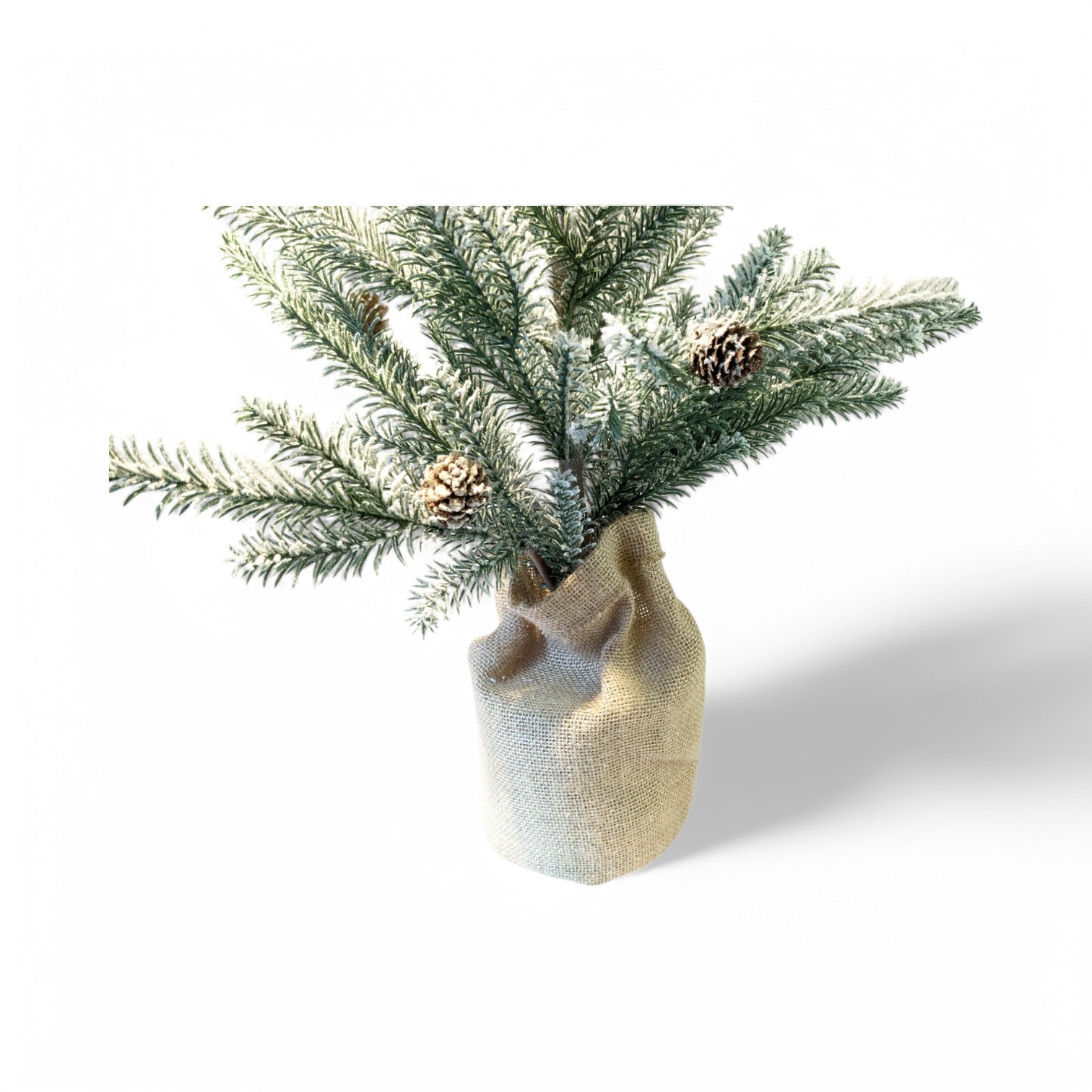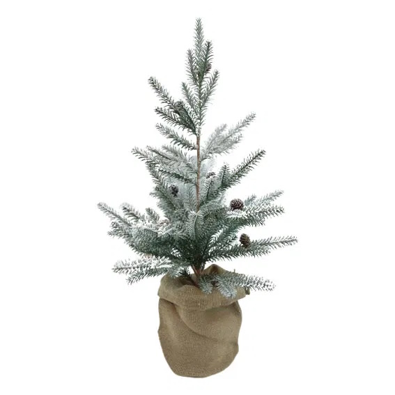 Kunstig juletræ med sne og kogler i jutesæk. 75 cm.