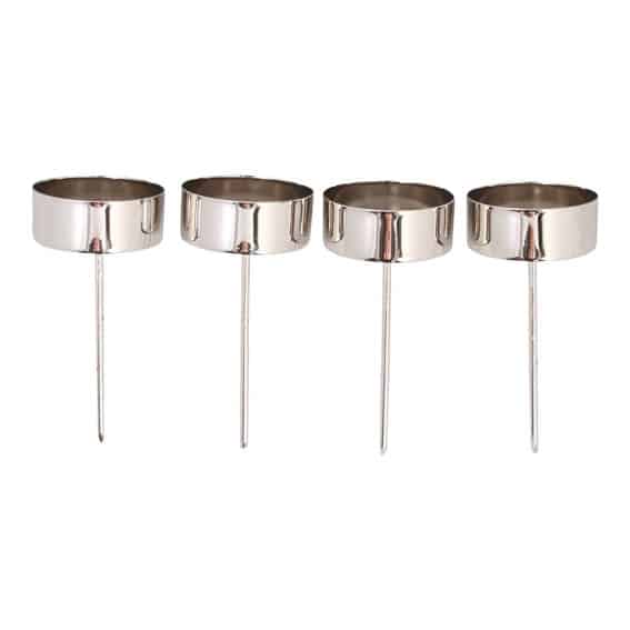 lysholdere på spyd i sølv metal til fyrfadslys 4 styk på 7 centimeter.