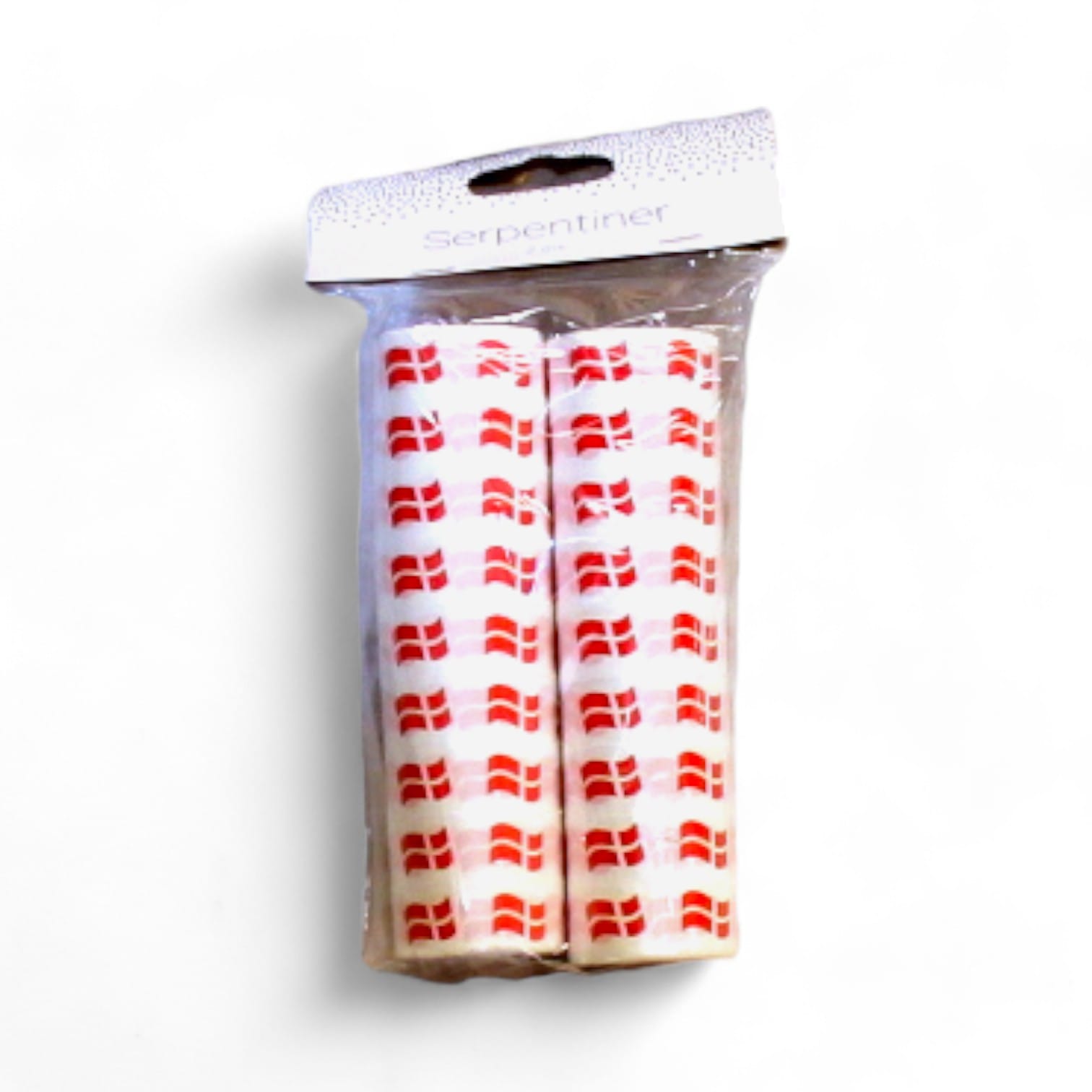 Serpentiner med danske flag, 2 ruller á 4 m. Festligt pynt alle fester og højtider