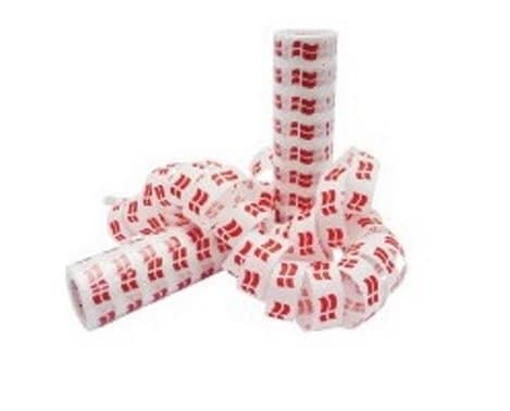 Serpentiner med danske flag, 2 ruller med 9 ringe i hver rulle. De måler 1,4 cm og er 4 m lange.