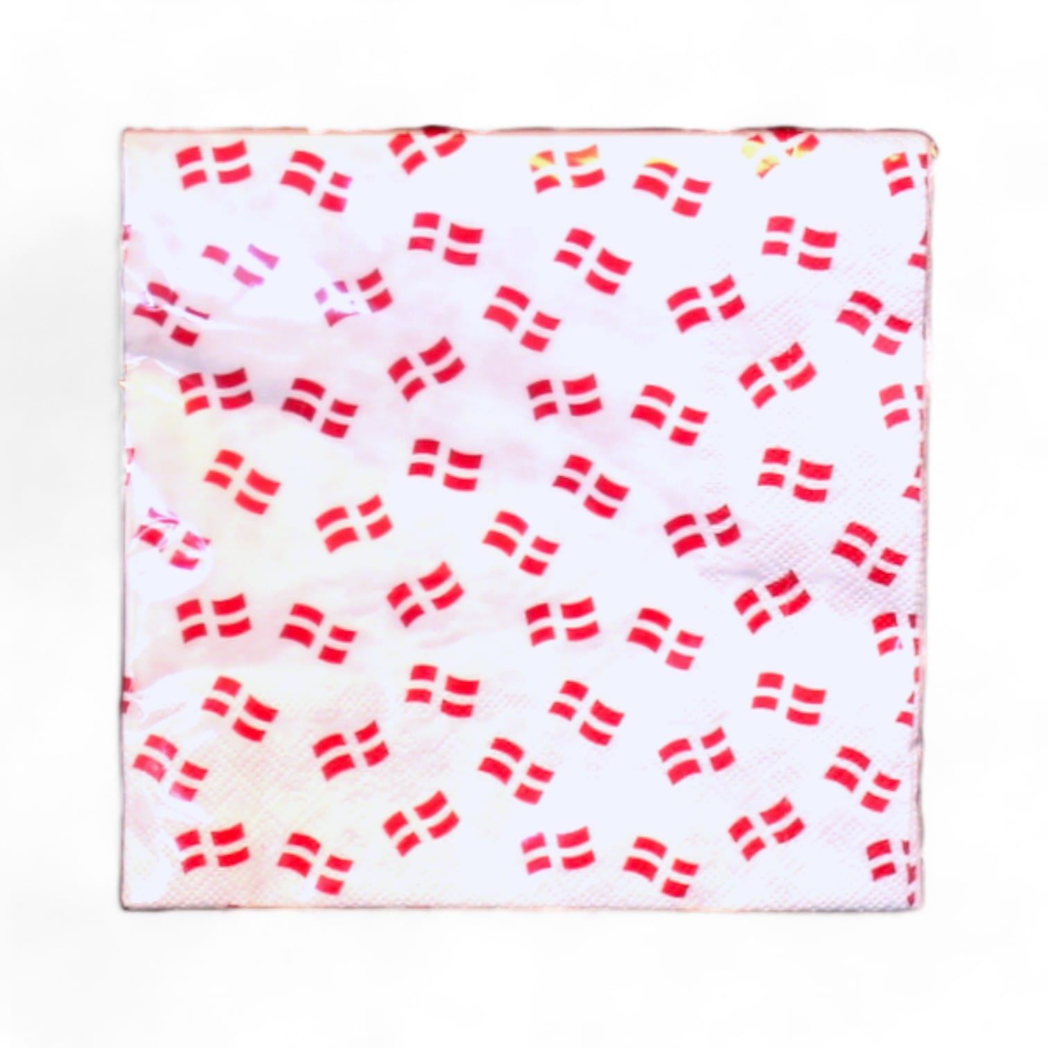 Super dekorative 3/lags servietter med det danske flag der blafrer rundt på hele serviettens hvide baggrund. Servietterne er i frokost størrelse 33 x 33 cm. Servietterne har tryk på alle 4 kvadrater og vil pynte på ethvert bord til fødselsdager eller i sommerhuset, kolonihavehuset eller på terassen. Brug også disse servietter som værtindegave, når du skal på besøg hos venner og familie i sommerlandet. Der er 20 stk. i pakken.