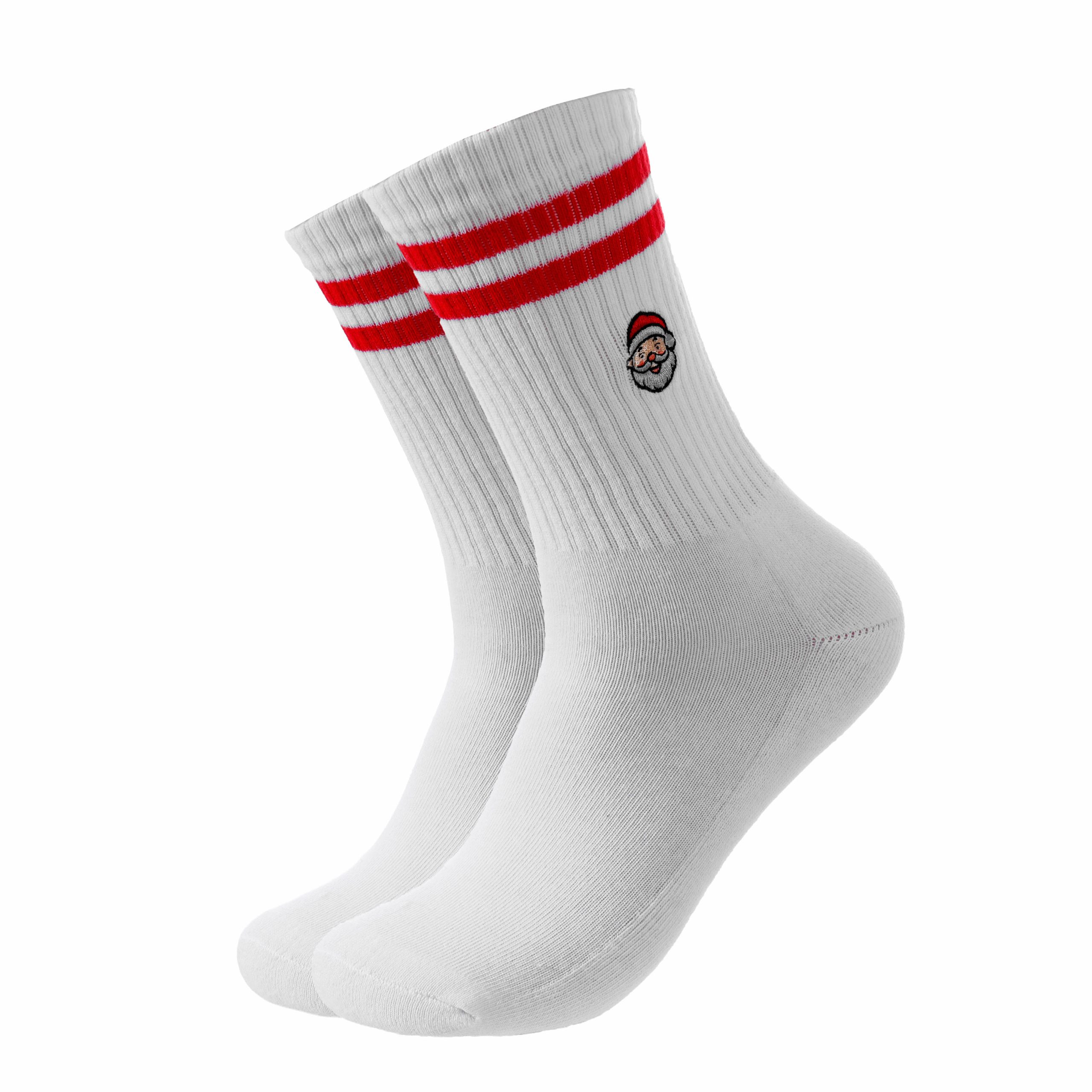 Bløde hvide tennisstrømper med en julemand og stribet rib. Strømperne har en god pasform og er af høj kvalitet. Perfekt kalender- eller adventsgave til voksne.