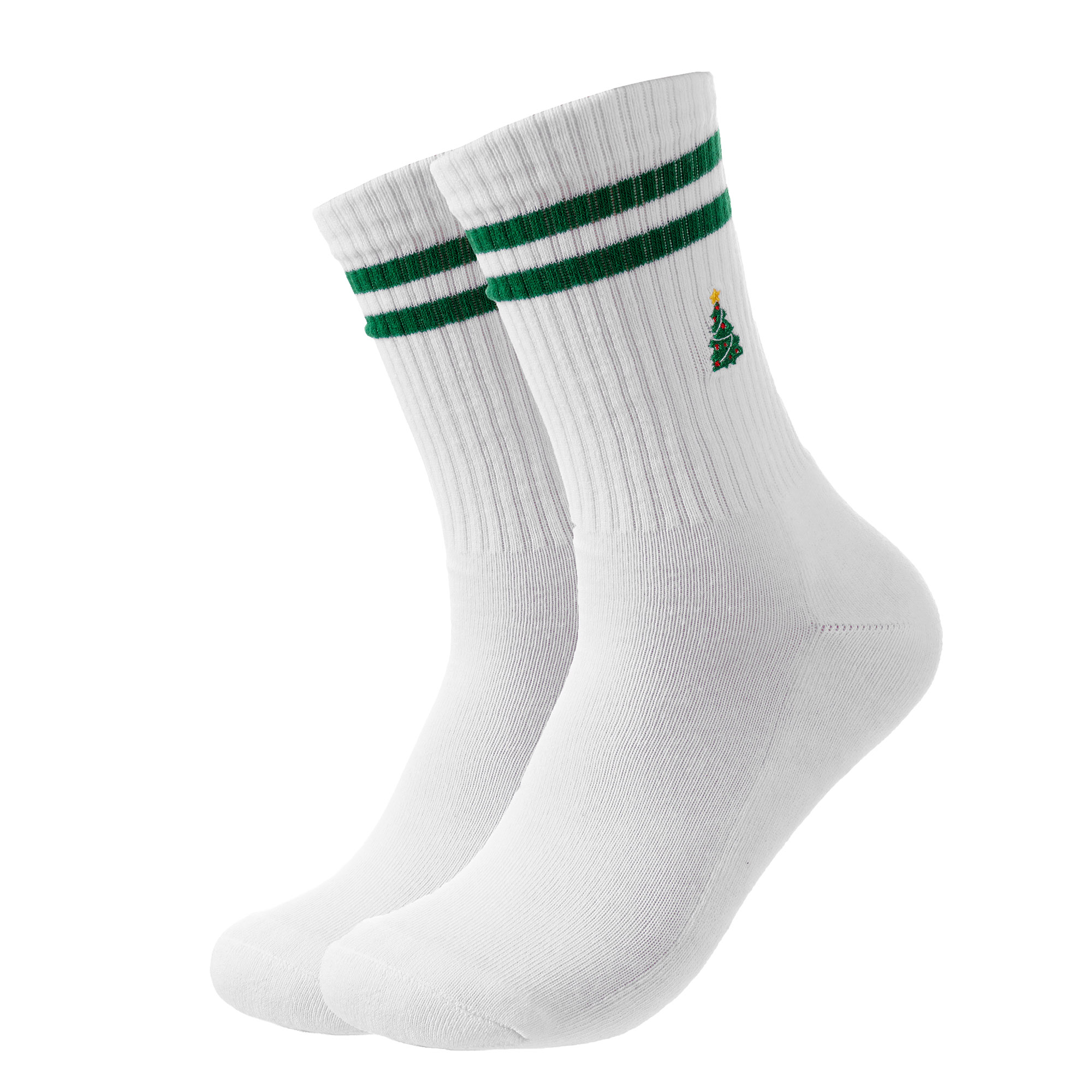Bløde hvide tennisstrømper med grønt juletræ og stribet rib. Strømperne har en god pasform og er af høj kvalitet. Perfekt kalender- eller adventsgave til voksne.