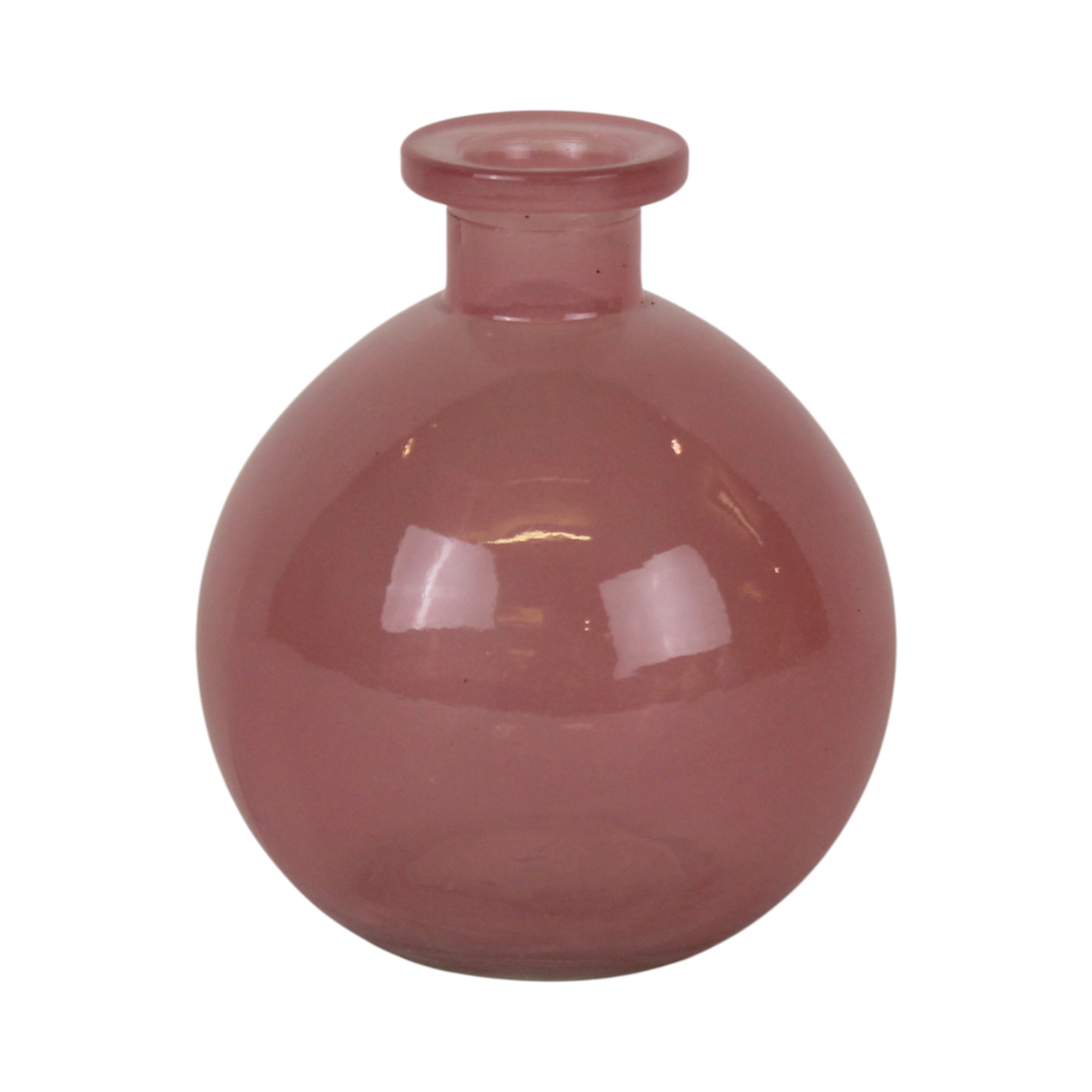 10 centimeter høj rund transparant glasvase i pink og diameter på 9 centimeter